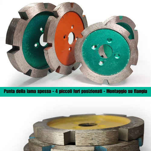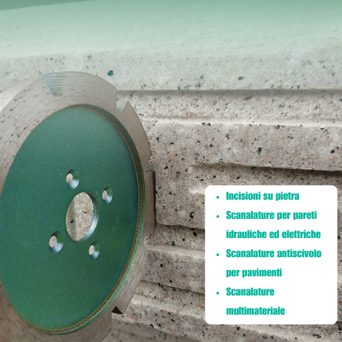 - Applicazione: taglio della pietra, realizzazione di scanalature nella pietra, realizzazione di scanalature nei muri, canaline portacavi, segnaletica stradale, ecc.