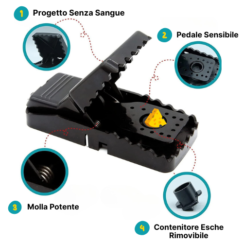 - Gestione: Metodo di smaltimento facile dei roditori catturati, riducendo al minimo disordine e contaminazione